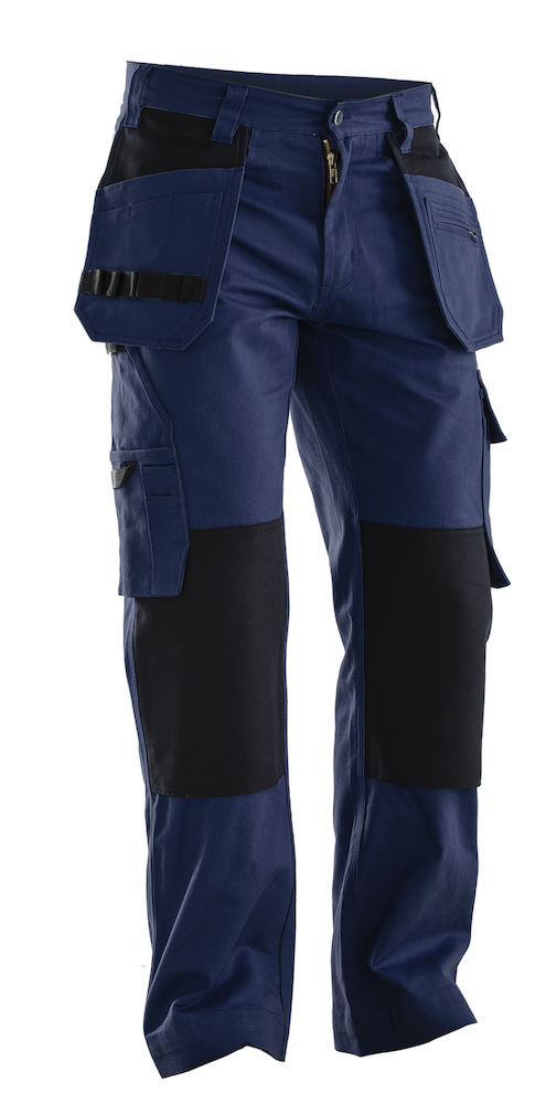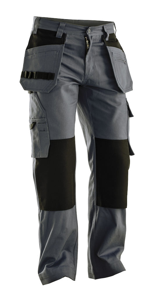 Praktische katoenen broek, ideaal voor de professional die op zoek is naar een voordelige broek met handige details zonder al te veel extra’s. De broek is gemaakt van hoogwaardig katoen in een lichter grammage voor een lichtgewicht broek. De broek is voorzien van verstevigde holsterzakken met compartiment en zak met rits, achterzakken met klep en klittenbandsluiting en duimstokzak met ruimte voor een mes. C-maten kunnen gemakkelijk met 5 cm worden verlengd door de omslag in de broekspijp. De broek is verstevigd met polyamide bij de kniestukzakken en holsterzakken.